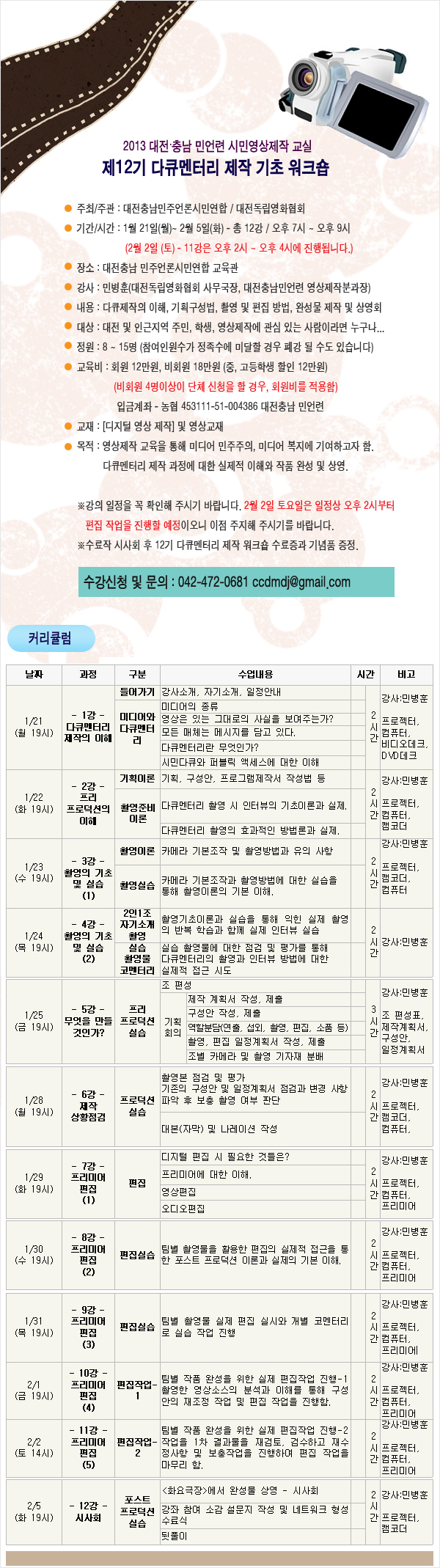 대전충남민언련과 대전독립영화협회에서는 제 12기 다큐제작강좌 수강생을 모집합니다.
