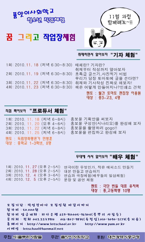 제목 [품앗이사회학교] 청소년 직업체험 '꿈 그리고' 11월 과정!