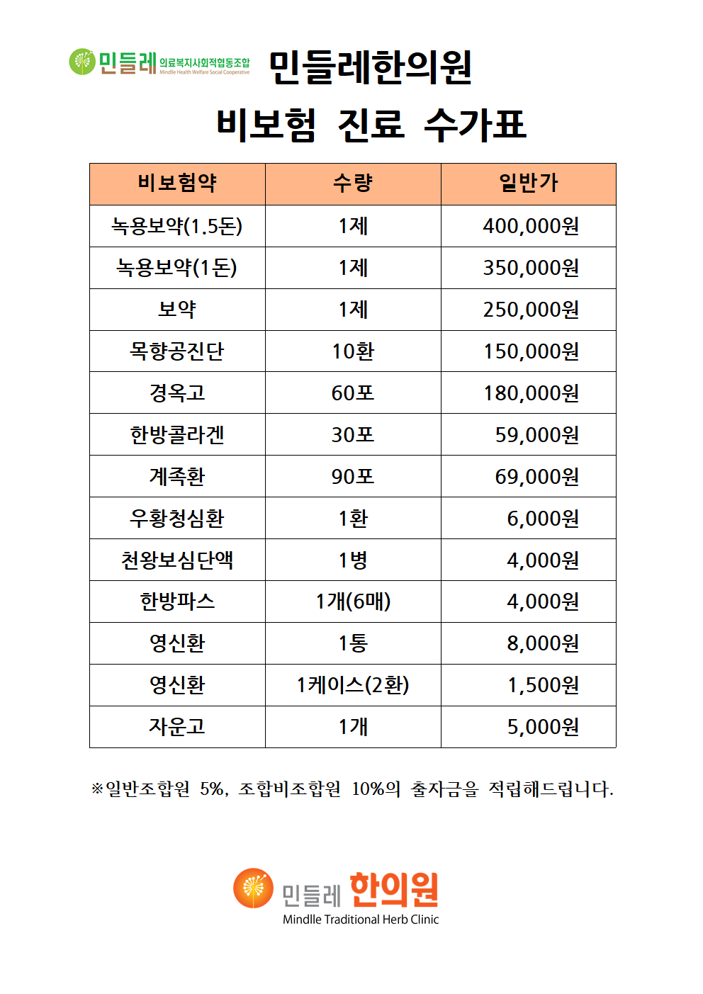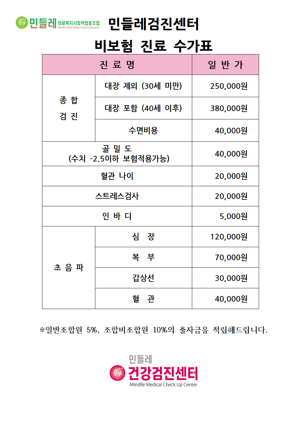 민들레 일차의료센터 비보험 진료 수가표